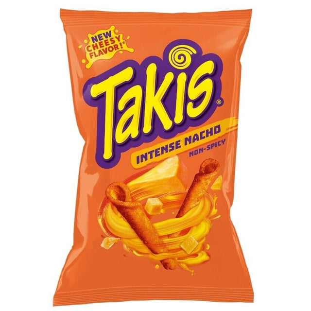 Takis Intense Nacho sind knusprige Maistortilla-Chips mit einem intensiven Nacho-Geschmack. Sie sind mit einer Mischung aus Käse, Gewürzen und einem Hauch von Paprika aromatisiert.